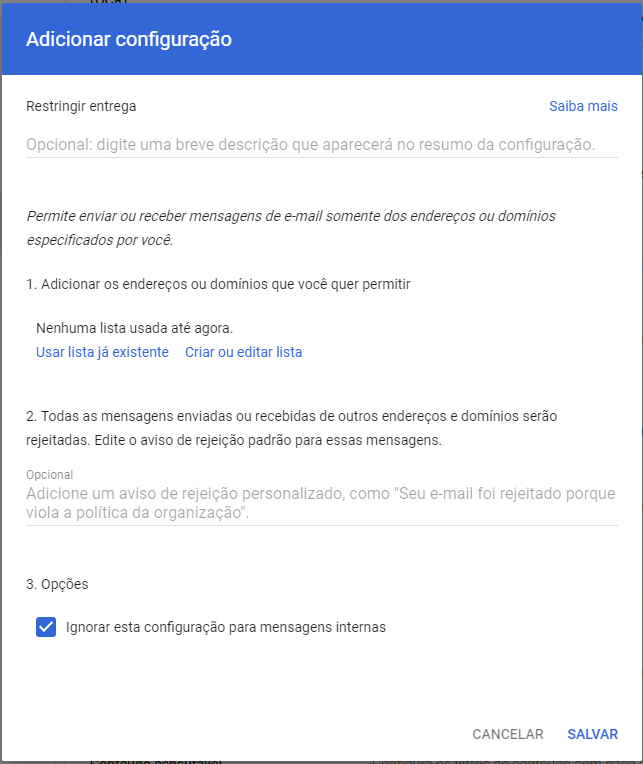 Segue o link para documentação Google: https://support.google.com/a/answer/2640542?hl=pt-BR#zippy=%2Cetapa-inicial-acessar-as-configura%C3%A7%C3%B5es-de-compliance-do-gmail-no-admin-console%2Cetapa-adicionar-os-endere%C3%A7os-ou-os-dom%C3%ADnios-que-voc%C3%AA-quer-permitir