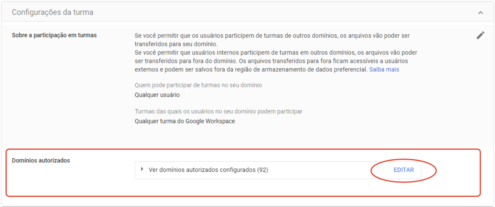 - Depois, na página de Configurações da turma, clique em “Editar” nas opções de “Domínios autorizados“.