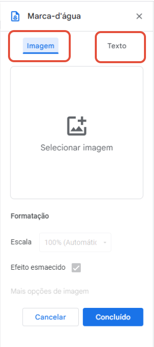 - No painel a direita, clique em Imagem para adicionar uma imagem como Marca-d’água ou clique em Texto para adicionar um texto.
