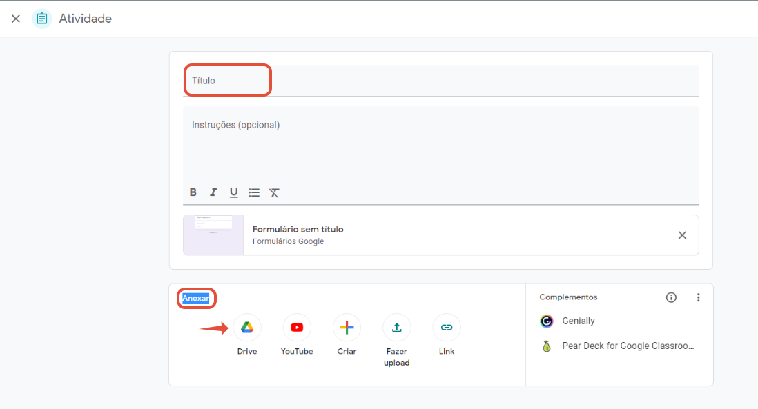 4. Crie um título para a Atividade e no Menu Anexar clique na opção Drive.