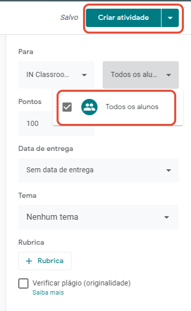 7. Certifique-se de que a opção Todos os alunos está selecionada e clique em Criar Atividade: