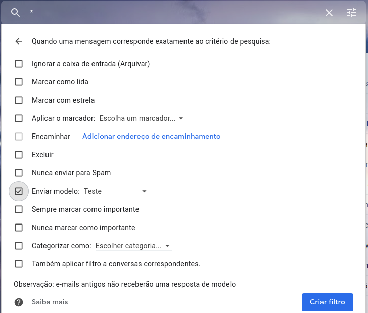 Importante: Nesta alternativa a mensagem defina como modelo de resposta será enviado para todos os e-mails que forem recebidos.
