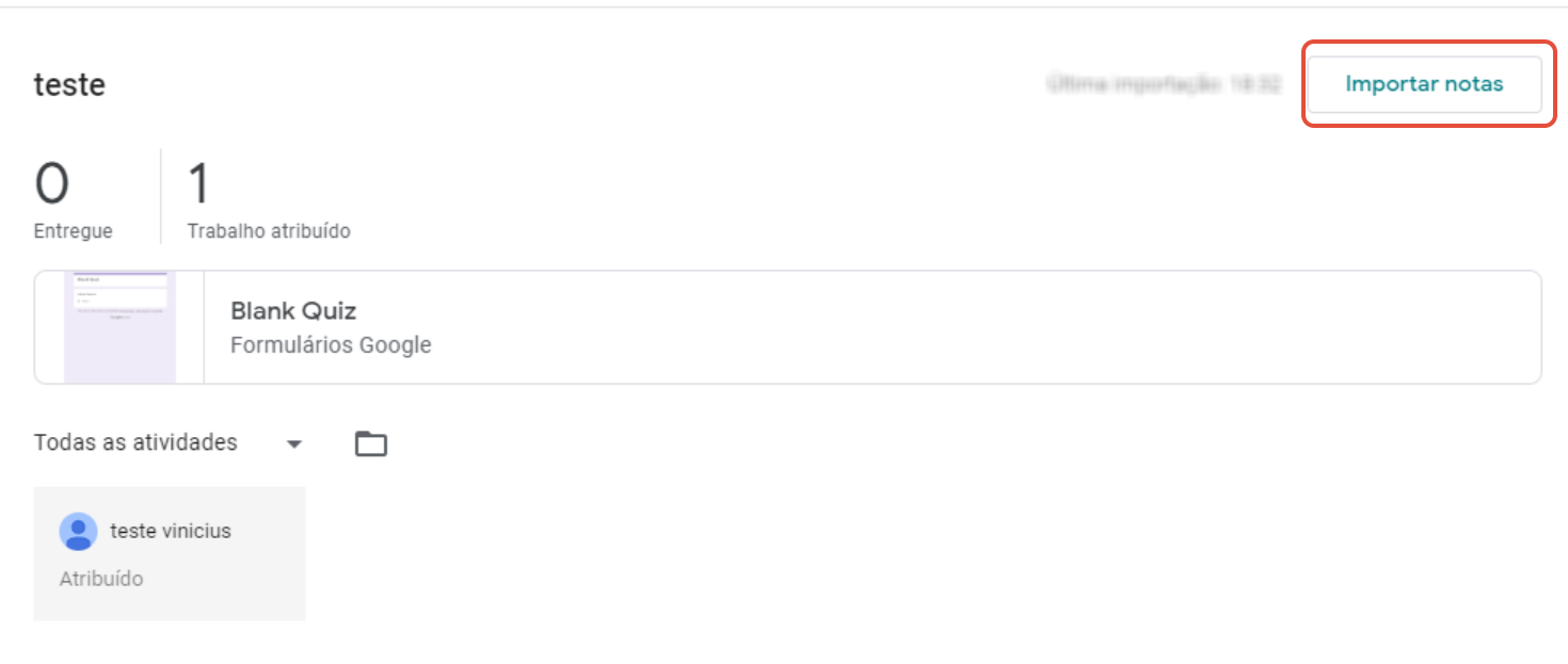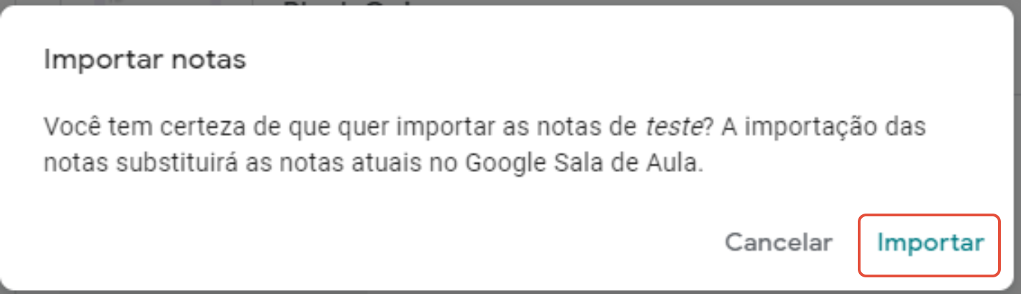 Quando você importa notas, todas elas são importadas. Não é possível selecionar apenas algumas. Se a atividade já tiver notas registradas, a importação as substituirá. Portanto, se o teste do Formulários Google for apenas uma parte da atividade, importe primeiro as notas do teste.