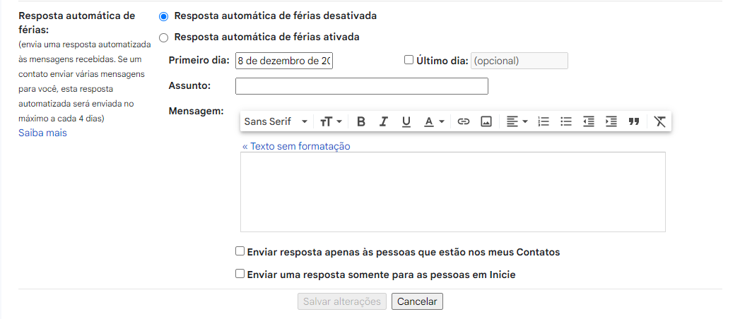 Observação: se você tiver uma assinatura do Gmail, ela será exibida na parte inferior da resposta automática de férias.